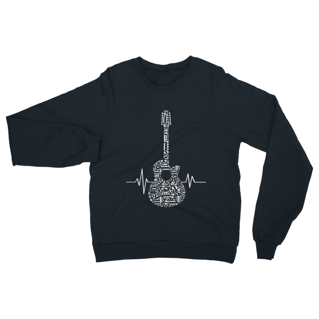 Ignite your passion for music with our unique Musical Heartbeat Guitar Sweatshirt! This stylish jumper is a true tribute to the art of sound, featuring an intricate white graphic of a guitar silhouette completely filled with a symphony of musical notes and symbols.